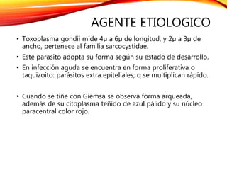 El documento describe la toxoplasmosis causada por el parásito Toxoplasma gondii. T. gondii tiene diferentes formas según su estado de desarrollo, incluyendo taquizoitos que se multiplican rápidamente en la infección aguda y quistes tisulares que contienen bradizoitos de reproducción lenta. El ciclo de vida de T. gondii involucra a los gatos como huéspedes definitivos y la transmisión a humanos ocurre principalmente por la ingestión de ooquistes contaminados. La mayoría de las infecciones