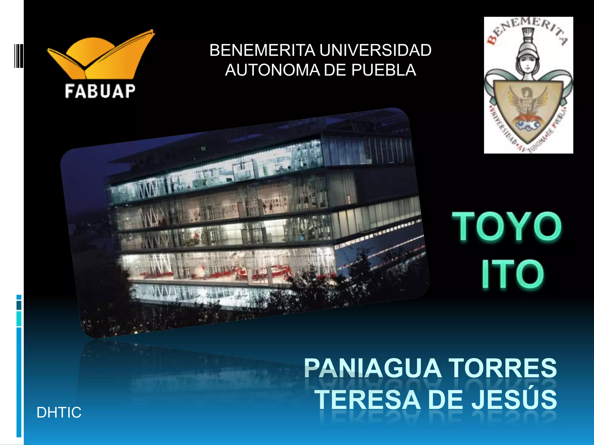 Toyo Ito es un importante arquitecto japonés nacido en 1941 que ha recibido numerosos premios como el Pritzker por su innovadora arquitectura orgánica y ligera. Algunas de sus obras más destacadas son la Mediateca de Sendai, el Edificio TOD'S en Tokio y la Torre de los Vientos. Ito busca crear edificios atemporales que fluyan con su entorno usando materiales industriales para estructuras ligeras que permitan la libertad y el movimiento de las personas.