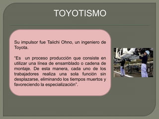 El toyotismo es un sistema de producción flexible desarrollado por Toyota que consiste en una línea de ensamblaje donde cada trabajador realiza una sola tarea. Se caracteriza por la producción variada de pequeñas cantidades de diversos modelos, el justo a tiempo, la automatización de procesos para evitar errores, y la eliminación de desperdicios. El toyotismo busca lograr cero errores, averías, demoras, papel exceso y existencias mediante una producción basada en pedidos y trabajadores multifuncionales.