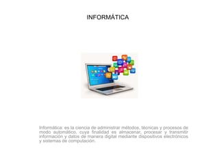 El documento define los conceptos clave de informática, incluyendo software, hardware, PC, gabinete, placa madre, placas controladoras, periféricos, memorias, microprocesador y otros componentes. Explica que el software son los programas y datos, el hardware son los componentes físicos, y que juntos permiten procesar y almacenar información de forma digital.