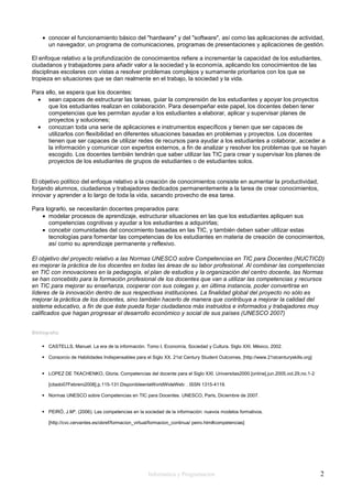 El documento argumenta que la escuela debe brindar una educación acorde a las demandas de una sociedad en constante cambio y evolución tecnológica. Esto requiere docentes capacitados en TIC que puedan guiar investigaciones de estudiantes, elaborar y supervisar proyectos, y utilizar redes para orientar a los estudiantes en la búsqueda de información, con el objetivo de aumentar la productividad formando personas dedicadas a crear conocimiento de manera permanente.