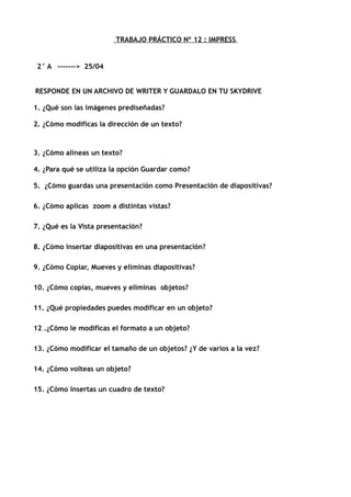 Este documento contiene 15 preguntas sobre las funciones básicas de Impress, como insertar y modificar diapositivas, objetos e imágenes. Las preguntas cubren temas como cómo alinear y modificar el formato de texto, aplicar zoom a distintas vistas, insertar y manipular diapositivas, objetos y cuadros de texto, y guardar presentaciones en diferentes formatos. El estudiante debe responder a cada pregunta en un archivo de Word y guardarlo en su SkyDrive.