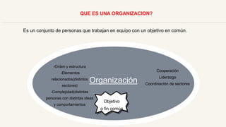 Este documento presenta información sobre organizaciones y administración. Define una organización como un conjunto de personas que trabajan juntas hacia un objetivo común, y discute las teorías estructuralista, de sistemas y de contingencia sobre administración. También cubre temas como la clasificación de organizaciones, las escuelas de administración, y los desafíos de la globalización como la desigualdad y el poder de las corporaciones multinacionales.