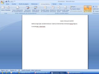El documento describe los pasos para crear cartas personalizadas para cada alumno utilizando una tabla en Access vinculada a un documento de Word. Primero se crea una tabla en Access con los datos de los alumnos como apellido, nombre y sector. Luego se abre un documento de Word, se crea una plantilla de carta y se vincula la tabla de Access. Finalmente, se inserta un campo combinado en la carta para mostrar automáticamente el apellido, nombre y sector de cada alumno.