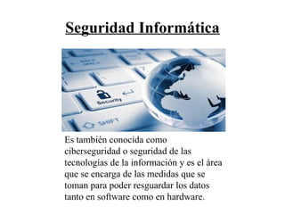 Este documento trata sobre la seguridad informática y describe los objetivos, amenazas y tipos de malware como virus, gusanos y troyanos. También explica los tipos de hackers como los de sombrero blanco y negro, y crackers, que buscan vulnerar sistemas de seguridad. La conclusión es que debido a estas amenazas, es importante tomar medidas como restricciones y autorizaciones para proteger datos en software y hardware.