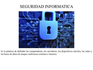 Este documento resume conceptos clave de seguridad informática como antivirus, malware, virus, gusanos, spyware, troyanos, rootkit, contraseñas y cracking de contraseñas. Explica que la seguridad informática defiende dispositivos de ataques externos e internos y concluye que para reducir el riesgo de ataques es necesario usar antivirus y tomar precauciones al descargar archivos.