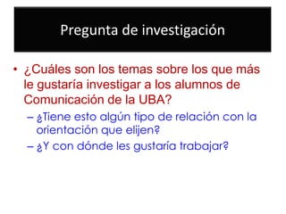 El documento presenta los resultados de una investigación realizada con 121 estudiantes de Ciencias de la Comunicación de la UBA en el año 2013. Se analizaron los temas de investigación preferidos por los estudiantes, su orientación elegida o por elegir, y dónde les gustaría trabajar. Los hallazgos principales son: 1) el tema más elegido fue la comunicación digital; 2) la orientación con más estudiantes fue periodismo; y 3) la mitad de los estudiantes de periodismo querían dedicarse a la investigación laboralmente.