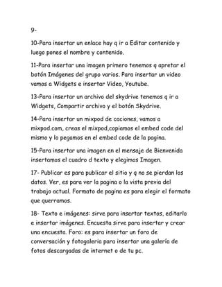 Este documento proporciona instrucciones para crear y modificar una página web en Webnode. Explica cómo crear una cuenta, diseñar la página principal, agregar y editar contenido como texto, imágenes y videos, insertar enlaces, archivos y widgets, y publicar el sitio web.