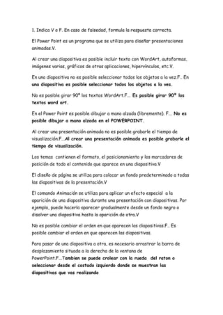 Este documento contiene 21 preguntas sobre funciones y comandos en PowerPoint. Proporciona respuestas verdaderas o falsas a afirmaciones sobre PowerPoint y luego pide que se respondan preguntas sobre cómo realizar diferentes tareas como aplicar animaciones y transiciones, cambiar el orden y formato de diapositivas, e insertar y modificar objetos.