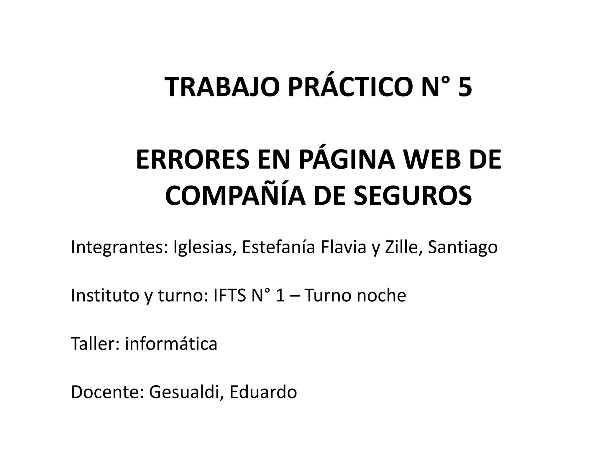El documento resume un trabajo práctico realizado por dos estudiantes sobre los errores encontrados en la página web de una compañía de seguros, incluyendo errores ortográficos, gramaticales, imágenes desactualizadas o de formato incorrecto, y hipervínculos que generan ventanas emergentes; la conclusión señala que la página presenta errores de ortografía, gramática, y deficiencias en la distribución de imágenes.