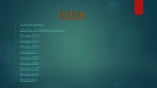 Este documento presenta una línea de tiempo que resume la evolución de los sistemas operativos desde la década de 1940 hasta la actualidad. En las décadas iniciales no existían sistemas operativos y los usuarios interactuaban directamente con el hardware. En la década de 1950 aparecieron los primeros sistemas operativos básicos. En las décadas siguientes surgieron sistemas operativos cada vez más avanzados que permitían la multiprogramación, tiempo compartido y tiempo real. Algunos de los sistemas operativos más importantes fueron MS-