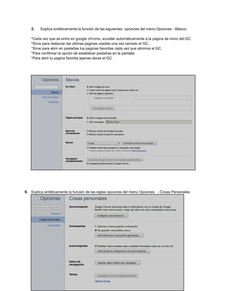 El documento describe las características y funcionalidades del navegador web Google Chrome. Explica que es un navegador gratuito de código abierto desarrollado por Google, y enumera 7 ventajas como su rapidez, personalización, estabilidad y privacidad. También describe los elementos de la ventana principal como la barra de menús, barra de título, botones para maximizar/minimizar y barra de desplazamiento. Finalmente, explica las opciones del menú como Historial, Descargas y Opciones para configurar la experiencia del usuario.