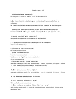 El documento describe cómo realizar diferentes tareas en PowerPoint como insertar imágenes, guardar presentaciones, aplicar zoom, insertar y modificar diapositivas y objetos. Explica cómo copiar, mover y eliminar elementos y cómo modificar el formato y tamaño de objetos y texto. Indica que es posible recortar videos en PowerPoint.