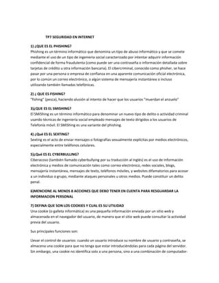 El documento habla sobre diferentes tipos de amenazas a la seguridad en Internet. Explica que el phishing implica que cibercriminales se hacen pasar por empresas confiables para robar información personal. También define fishing, smishing (enviar mensajes de texto fraudulentos), sexting (enviar contenido sexual), cyberbullying, y el uso de cookies. Además, introduce los conceptos de vishing (suplantar identidad por voz) y cloning (suplantar tarjetas).