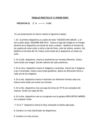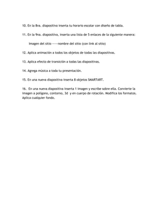 El documento proporciona instrucciones para completar un proyecto de PowerPoint que incluye crear 15 diapositivas con diferentes objetos y formatos como logotipos, cuadros de texto, autoformas, imágenes, fontwork, sopas de letras, crucigramas, tablas, listas de enlaces, objetos SmartArt e imágenes con efectos. El proyecto también requiere aplicar animaciones, transiciones y música.