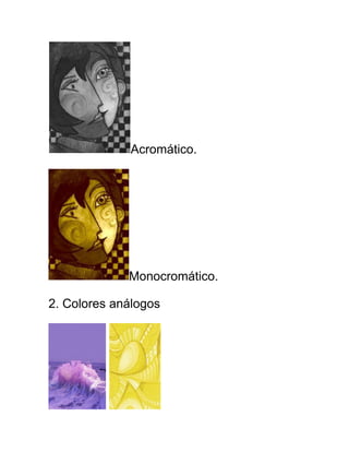 El documento describe diferentes técnicas para variar el tratamiento de los colores en composiciones de imagen, incluyendo el uso de colores cromáticos y acromáticos, colores análogos, complementarios, cálidos y fríos, variaciones en saturación y valores, y contrastes de claves de valores mayores y menores.