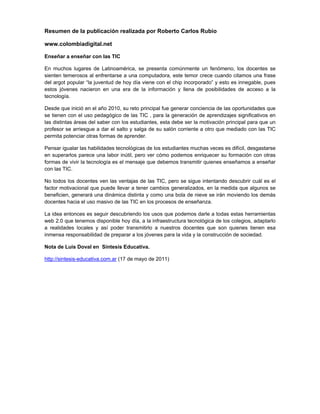 El documento presenta tres resúmenes de artículos sobre el uso de las TIC en la educación. El primero discute los desafíos que enfrentan los docentes al integrar las TIC en sus clases, como la falta de capacitación adecuada. El segundo propone que la prudencia es un concepto clave para enseñar sobre el uso responsable de la tecnología. El tercero analiza la importancia de seguir una "ruta crítica" que guíe la selección y uso pedagógico de medios digitales en las aulas.