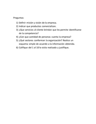 El documento presenta un trabajo práctico sobre una visita a la empresa Johnson Acero. Contiene preguntas sobre la misión y visión de la empresa, los productos que comercializa, los servicios que ofrece a los clientes, la cantidad de empleados y la estructura organizacional. Las respuestas detallan que la misión es ofrecer productos de calidad a través de sus centros de distribución y showrooms, y su visión es ampliar la exportación. La empresa comercializa cocinas, placares, sistemas abiertos, piletas y mesadas de acero