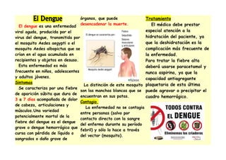 El dengue es una enfermedad viral transmitida por la picadura del mosquito Aedes aegypti o Aedes albopictus. Se caracteriza por fiebre alta de 3 a 7 días acompañada de dolores musculares y de cabeza. La deshidratación es la complicación más común. El tratamiento consiste en paracetamol para la fiebre y especial atención a la hidratación del paciente.