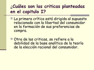 El documento analiza conceptos económicos como la teoría de la elección racional del consumidor, el comportamiento del consumidor, los oligopolios y los monopolios. Examina cómo estos temas se ilustran en episodios de Los Simpson, incluyendo las críticas a la teoría de la elección racional, la empresa de pretzels de Marge como un duopolio y el monopolio de energía del Sr. Burns.