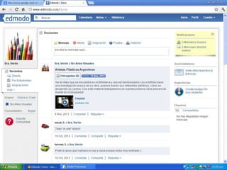 Este documento presenta una plataforma educativa sobre Artes Visuales desarrollada por el grupo Integral de la Universidad Nacional de La Plata. La plataforma permite a docentes crear perfiles, enviar tareas a estudiantes, comunicarse con ellos, y alojar recursos educativos como textos e imágenes. También permite a estudiantes crear perfiles, acceder a tareas y calificaciones, y comunicarse con docentes. La intención es facilitar el aprendizaje remoto de Artes Visuales.