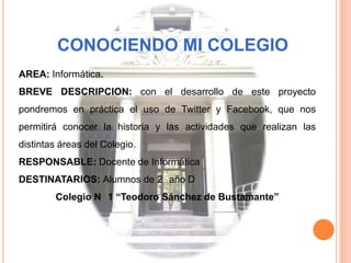 Este proyecto propone el uso de Twitter y Facebook en el aula para que los estudiantes investiguen la historia y actividades de los distintos clubes y áreas del colegio. Los estudiantes crearán cuentas en las redes sociales y publicarán información sobre los clubes usando hashtags. Luego producirán una presentación multimedia y libro digital con sus hallazgos. El proyecto busca desarrollar competencias tecnológicas y el uso responsable de las redes sociales.