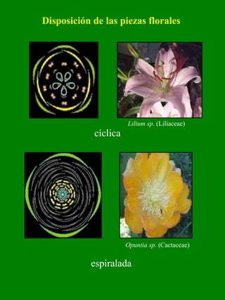El documento detalla el sistema reproductor de las Magnoliophyta, describiendo las piezas florales y sus disposiciones en diversas especies como Lilium y Opuntia. Se analiza la estructura del cáliz, corola, androceo y gineceo, incluyendo las variaciones en la presentación y número de sépalos, pétalos, estambres y carpelos. Además, se menciona la ubicación del ovario y los tipos de estigmas presentes en distintas plantas.