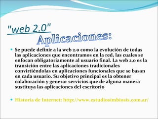 La web 2.0 se define como la evolución de las aplicaciones en internet que se enfocan en el usuario final y se basan en la colaboración y servicios que reemplazan aplicaciones de escritorio. Un wiki es un sitio web abierto donde múltiples usuarios pueden crear, editar o borrar contenido compartido, como Wikipedia, que es un diccionario colaborativo hecho por miles de personas.