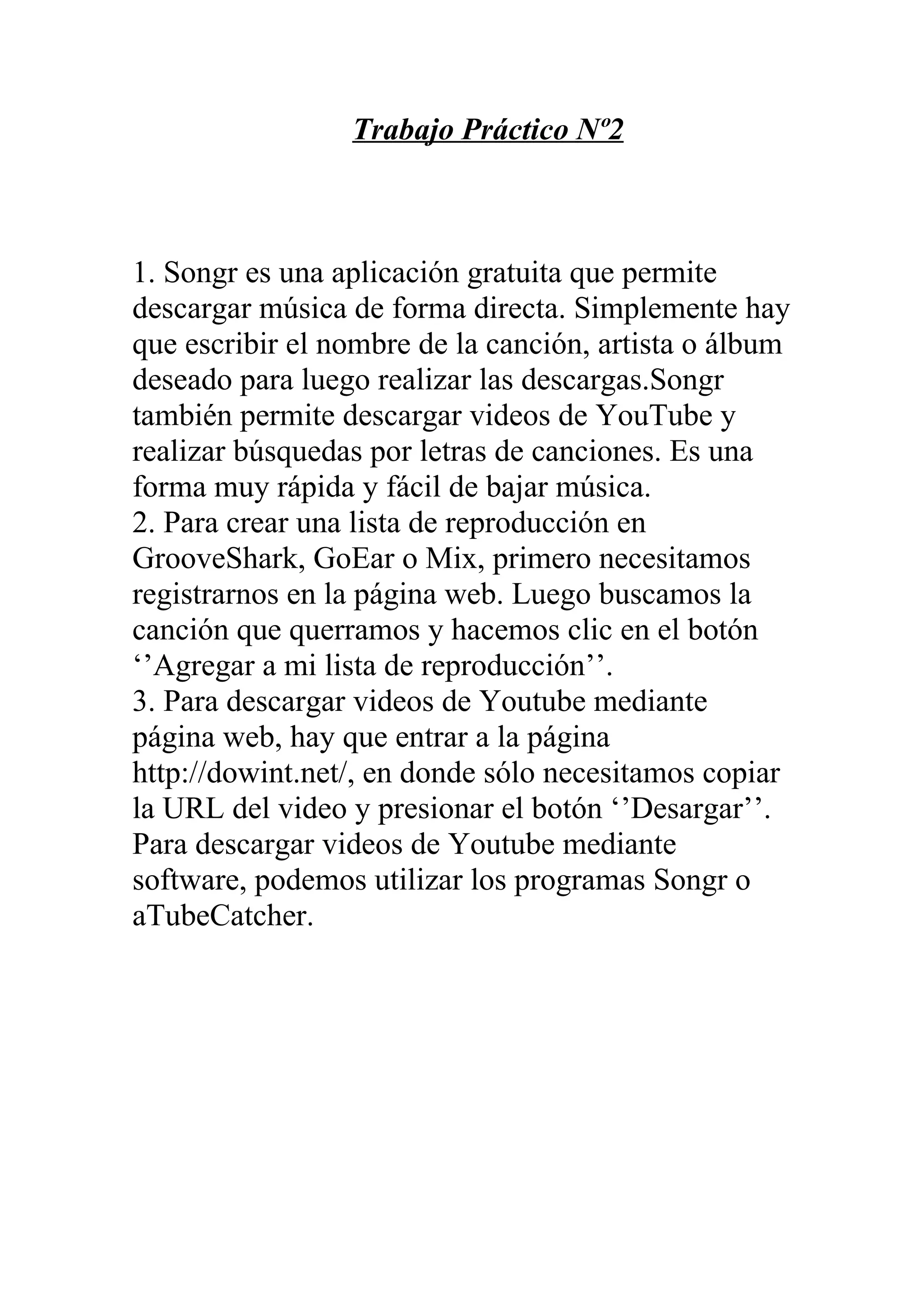 Songr es una aplicación gratuita para descargar música y videos de YouTube de forma rápida y fácil. Para crear listas de reproducción en sitios como GrooveShark y Mix, los usuarios deben registrarse primero y luego agregar canciones seleccionadas a sus listas. Existen páginas web como dowint.net y programas como Songr y aTubeCatcher que permiten descargar videos de YouTube copiando su URL o mediante una interfaz de software respectivamente.