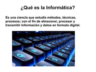 Este documento presenta un resumen de los conceptos básicos de informática. Define informática como la ciencia que estudia métodos para almacenar, procesar y transmitir datos digitales. Explica que el hardware son los componentes físicos de una computadora como periféricos de entrada, salida y entrada/salida. El software son programas y rutinas que permiten a la computadora realizar tareas.