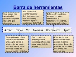 El documento describe las diferentes opciones disponibles en la barra de herramientas de Internet Explorer, incluyendo abrir, guardar e imprimir páginas; copiar contenido; modificar la apariencia de la web; guardar preferencias; opciones de seguridad y programas; obtener información sobre el uso de Internet; navegar hacia atrás y adelante en el historial; actualizar páginas; detener cargas; acceder a favoritos y direcciones guardadas; y define términos como URL, hipertexto y sitio web.