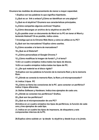 El documento contiene 26 preguntas sobre conceptos relacionados con computadoras, incluyendo medidas de almacenamiento, hipertexto, enlaces, SkyDrive, marcadores, historial, personalización de navegadores, tipos de discos y computadoras, memoria RAM y ROM, procesadores, periféricos, impresoras y cómo subir archivos entre dispositivos.
