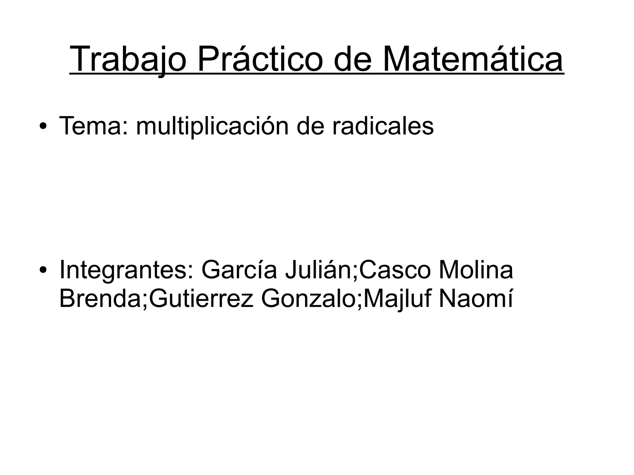 Este documento presenta los componentes y métodos para multiplicar radicales. Explica que para radicales con el mismo índice se multiplican los números dentro de los radicales y se suman los exponentes, mientras que para radicales con diferente índice se determina el mínimo común múltiplo de los índices y se dividen los índices originales por el mínimo común para luego sumar los exponentes. Proporciona ejemplos ilustrativos de ambos métodos.