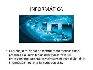 Este documento define e introduce conceptos básicos de informática como software, hardware, computadora, CPU, microprocesador, memoria ROM, memoria RAM, placa madre, placa controladora y periféricos. Explica que el software se comunica con el hardware para procesar y almacenar digitalmente la información de manera automática, y que los periféricos de entrada y salida permiten la entrada y salida de datos entre la computadora y el mundo exterior.