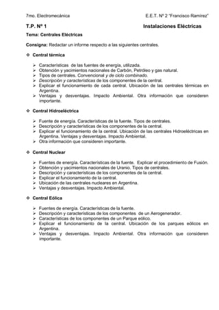 El documento solicita la redacción de un informe sobre centrales eléctricas, incluyendo centrales térmicas, hidroeléctricas, nucleares y eólicas. Para cada tipo de central se pide describir la fuente de energía, los componentes, el funcionamiento y ubicaciones en Argentina, así como ventajas, desventajas e impacto ambiental. Además, proporciona enlaces y bibliografía recomendada para completar el informe.
