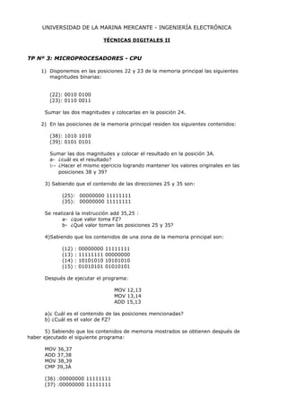 Este documento presenta 14 ejercicios sobre el uso de microprocesadores. Los ejercicios cubren temas como sumas, movimientos de datos, comparaciones y programación básica en ensamblador. Se pide al estudiante interpretar y codificar instrucciones y pequeños programas, identificar valores de registros y banderas después de la ejecución, y diseñar programas para realizar operaciones como multiplicación y movimiento/procesamiento de datos en memoria.