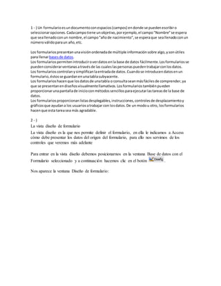 1. Los formularios son documentos con campos que permiten introducir y organizar múltiples datos de forma ordenada. Permiten introducir datos fácilmente en una base de datos subyacente y controlar y simplificar la entrada de datos.