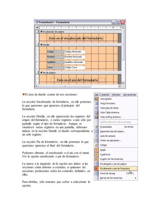 2. La vista diseño permite definir el diseño visual de un formulario mediante la adición de controles en diferentes secciones. Proporciona herramientas para diseñar eficazmente el formulario.