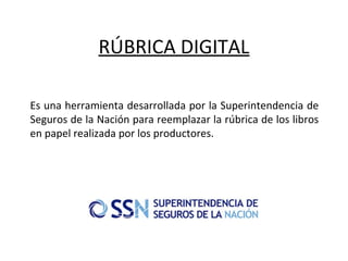 Este documento resume una presentación sobre la Rúbrica Digital, una herramienta desarrollada por la Superintendencia de Seguros de la Nación para reemplazar la rúbrica de libros en papel. La Rúbrica Digital permite a los productores de seguros cargar datos de forma online, eliminando costos de impresión y envío. Los productores deben comprar créditos para cargar registros y varias empresas privadas ofrecen servicios para facilitar la carga de datos en la Rúbrica Digital.
