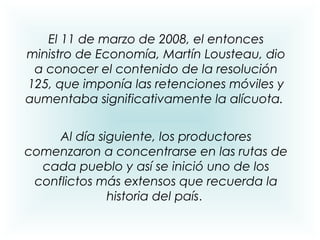 La resolución 125 impuso retenciones móviles y aumentó las alícuotas a los productores agropecuarios durante el gobierno de Cristina Kirchner, lo que provocó grandes protestas y cortes de ruta por parte del campo. El vicepresidente Julio Cobos decidió el destino de la ley al votar "no positivo" en el Senado para desempatar la votación, lo que significó que la resolución fue rechazada.