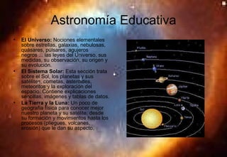 El documento resume los principales componentes del Sistema Solar, incluyendo el Sol, los planetas y sus satélites, cometas, asteroides, meteoritos. También describe brevemente la Tierra y la Luna, incluyendo su formación y movimientos. Explica que el objetivo es ofrecer una introducción sencilla al Sistema Solar sin entrar en detalles técnicos.