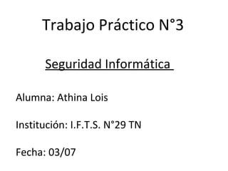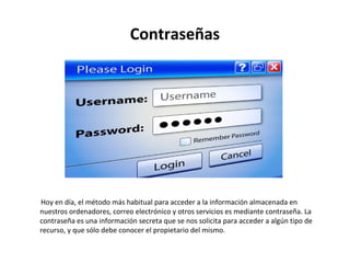 Este documento ofrece consejos sobre la creación y uso de contraseñas seguras. Recomienda no usar información personal como nombres o fechas en las contraseñas, y en su lugar sugiere usar frases con las primeras letras de cada palabra u ocho caracteres al azar incluyendo letras, números y símbolos. Además, aconseja cambiar las contraseñas cada dos o tres meses y no compartirlas con otros para mantener la seguridad de la información.