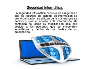 El documento habla sobre la seguridad informática. Explica que consiste en asegurar que los recursos de un sistema de información solo sean accesibles por personas autorizadas. También cubre conceptos clave como confidencialidad, integridad y disponibilidad de datos. Finalmente, menciona algunas amenazas comunes como hackers y cómo protegerse de ellos utilizando firewalls y antivirus actualizados.
