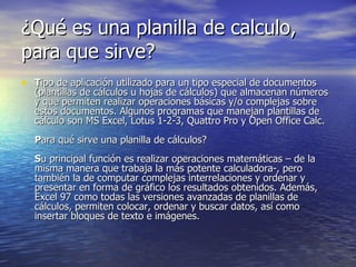 Una planilla de cálculos es una aplicación que permite almacenar y realizar cálculos matemáticos sobre números. Programas populares incluyen Excel, OpenOffice Calc y Google Sheets. Las planillas de cálculos dividen la información en filas, columnas y celdas para organizar y relacionar datos numéricos y presentar resultados en gráficos. OpenOffice es un ejemplo de suite ofimática gratuita que incluye una planilla de cálculos.