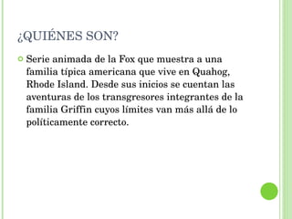 El documento analiza la serie animada "Padre de Familia", destacando sus personajes principales y el enfoque irreverente en la narración. A través de críticas y parodias a temas socioculturales, la serie invita a cuestionar el sistema de valores contemporáneos. El episodio polémico 'Family Gay' ejemplifica la transgresión de límites al abordar la homosexualidad y la religión de forma provocativa.