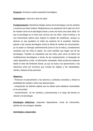 Los maestros planean una exposición tecnológica para niños de 5 años para mostrar cómo ha cambiado la tecnología con el tiempo y cómo se usa hoy. Los niños aprenderán sobre objetos tecnológicos antiguos y modernos, cómo la tecnología mejoró la comunicación y educación, y crearán materiales como carteles y entrevistas para la exposición final en la escuela.