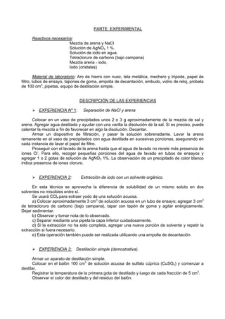El documento presenta un trabajo práctico sobre sistemas materiales. El objetivo es reconocer materiales y su manipulación, medir volúmenes, y reconocer sistemas homogéneos y heterogéneos. Se describen cuatro experiencias: 1) separar una mezcla de sal y arena mediante disolución y filtración, 2) extraer yodo de una solución acuosa usando un solvente orgánico, 3) destilar una solución de sulfato cúprico para observar cambios de color y temperatura, y 4) vol