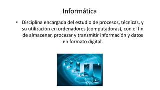 El documento describe los componentes básicos de una computadora personal (PC), incluyendo el hardware como la CPU, placa madre, memoria RAM y ROM, y microprocesador, y el software como sistemas operativos y programas. También explica periféricos de entrada y salida y cómo juntos el hardware y software permiten que una PC procese y almacene datos de forma digital.