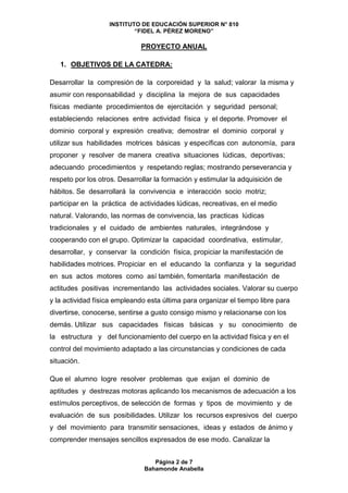 Este documento presenta el proyecto anual de la cátedra de Educación Física para el curso 1° del Instituto de Educación Superior N° 810 "Fidel A. Pérez Moreno". El proyecto describe los objetivos de la cátedra, la estructura y organización de los contenidos en cuatro unidades didácticas sobre vóley, básquet, natación y educación transversal, y la metodología constructivista y el uso de TIC como un blog que se utilizará para apoyar el proceso de enseñanza y aprend