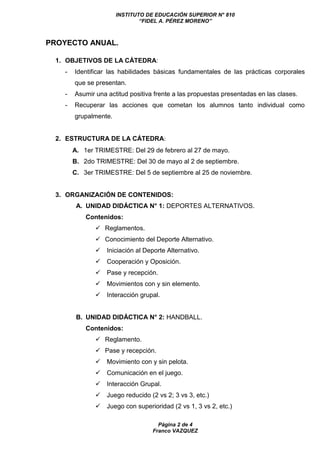 Este documento presenta el proyecto anual de la cátedra de Educación Física para 5to año. El proyecto incluye 4 unidades didácticas sobre deportes alternativos, handball y básquet, además de una unidad transversal sobre los beneficios de la actividad física. Se utilizarán estrategias como el juego, las TIC y un blog grupal para promover el aprendizaje colaborativo y desarrollar habilidades motrices de los estudiantes.